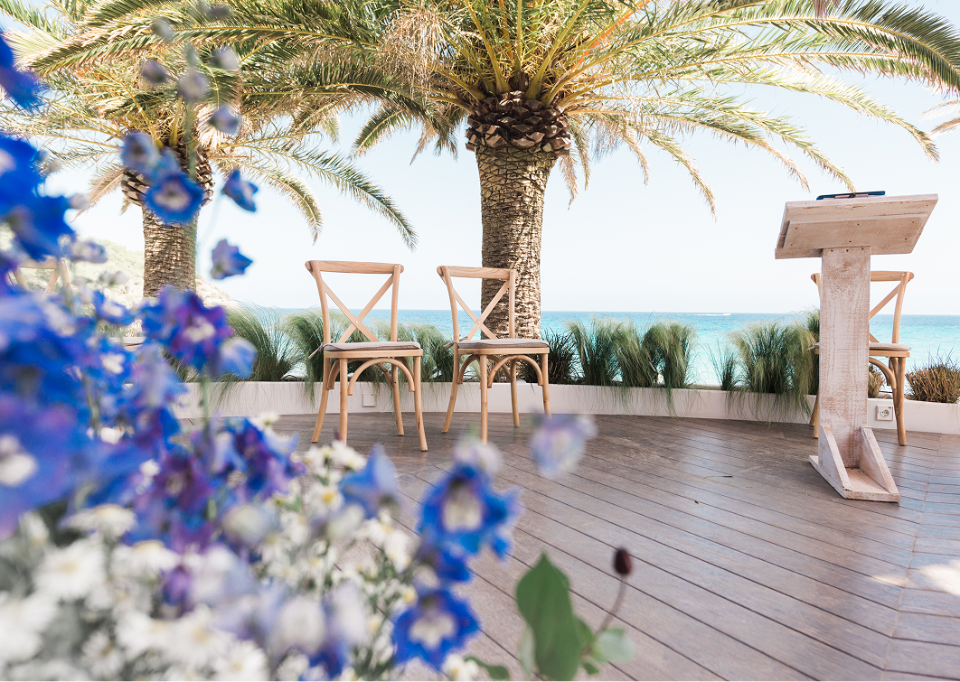 Su amplia terraza con vistas al mar es el escenario ideal para ceremonias, recepciones al atardecer y largas cenas mediterráneas junto a quienes más quieres.